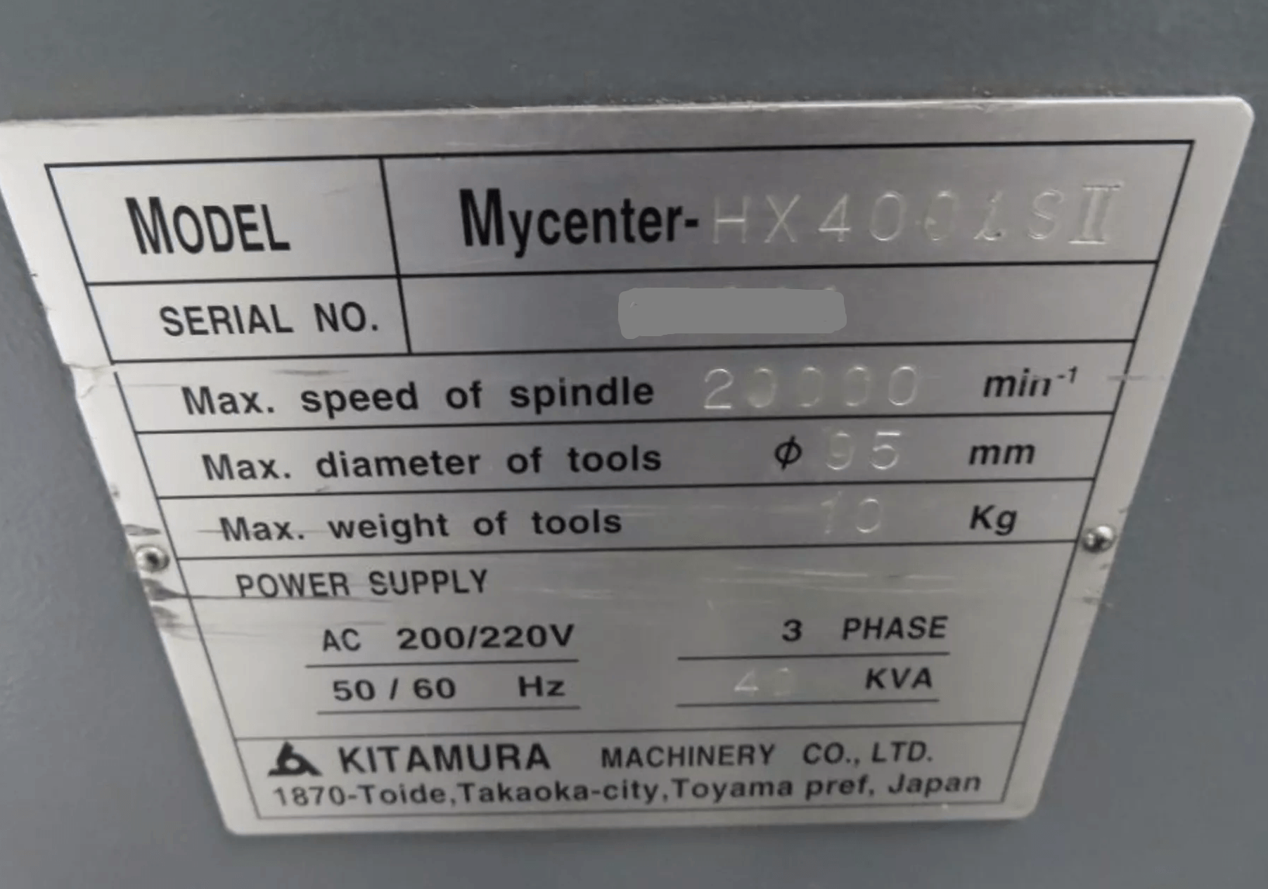 | Spindle Motor: 30 HP (22 kW) |